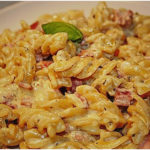 Dann die zwischenzeitlich knapp bissfest gekochten Nudeln dazugeben, in der Pfanne bei starker Hitze kurz durchschwenken, eventuell noch mit etwas Nudelwasser angießen.