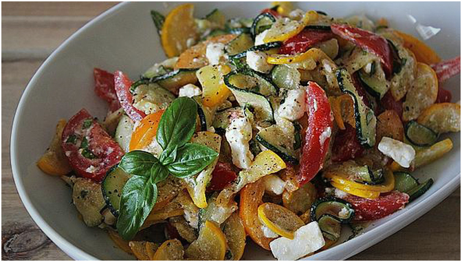 Die Tomaten waschen und in Spalten schneiden. Den Fetakäse würfeln. Beides zur Zucchini geben. Das Basilikum klein hacken und ebenfalls dazugeben. Für das Dressing den Essig mit 1-2 EL Öl und dem Honig verrühren. Mit Salz und Pfeffer abschmecken. Das Dressing über den Salat geben und mit dem Gemüse kurz verrühren.