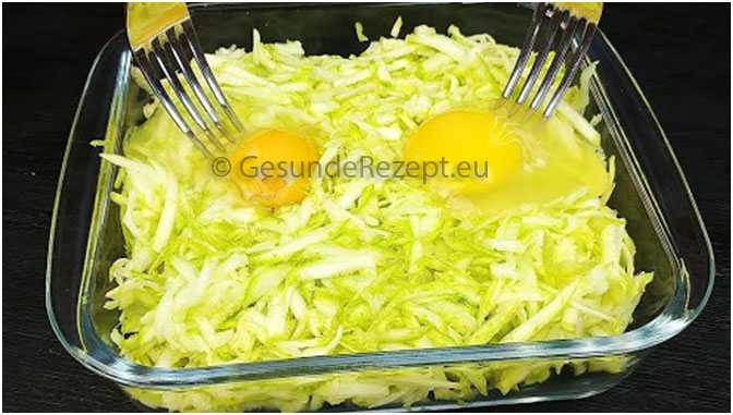 Reiben Sie die Zucchini auf einer großen Reibe und mischen Sie sie mit Eiern, Salz, Pfeffer, Ihren Lieblingsgewürzen, geriebenem Knoblauch und gehackten Kräutern. Die Masse mischen, bis sie homogen ist.