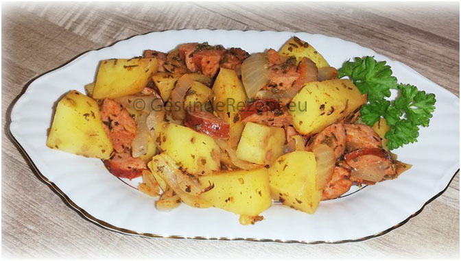 Zwiebeln schälen und in nicht zu dünne Scheiben schneiden. Im Olivenöl andünsten, jedoch nicht braun werden lassen. Heiße Fleischbrühe angießen, mit Salz und Pfeffer abschmecken und 20 Minuten köcheln lassen. Kartoffeln schälen, waschen, in kleine Würfel schneiden und in die Fleischbrühe geben. Weiter köcheln lassen, 5 Minuten vor Ende der Garzeit die in Scheiben geschnittene Cabanossi in den Eintopf geben. Schnittlauch waschen und in Röllchen schneiden. Den Eintopf mit Salz, Pfeffer und Majoran abschmecken, die Schnittlauchröllchen darüber streuen und heiß servieren.