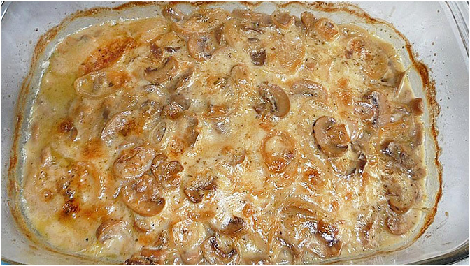 Zwiebeln schälen und in Ringe schneiden. Bei frischen oder ganzen Pilzen, diese putzen und in Scheiben schneiden. Öl portionsweise in einer großen Pfanne erhitzen. Schnitzel darin von beiden Seiten kräftig anbraten. Mit Salz und Pfeffer würzen und in eine große, geölte Auflaufform legen.